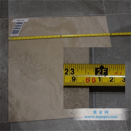 在規格的測試中,小編用卷尺從正面測試,得到的數據是600mm*600mm。與產品的規格相對應。然后再測對角線,測量結果顯示也符合參數尺寸。以此看出匯亞TT芭莎巖石的工藝切割十分完美準確的。