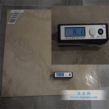 光澤度的測評,小編把瓷磚擦干凈后,把儀器放在匯亞TT芭莎巖石的不同位置,度數相差不大,大多接近8度。匯亞TT芭莎巖石,光感柔和細膩,避免了光污染的產生。