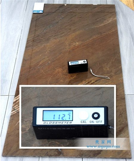 接下來(lái),美家網(wǎng)測(cè)評(píng)小組對(duì)這款瓷磚的光澤度進(jìn)行了測(cè)試。測(cè)評(píng)人員將光澤測(cè)試儀置于瓷磚表面,通過(guò)不斷的變換位置,測(cè)得的結(jié)果均是112.7度。