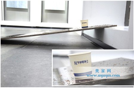 瓷磚的防滑性往往也是消費(fèi)者最關(guān)注的問(wèn)題之一,它關(guān)系到人走在上面是否安全。因此,這點(diǎn)往往會(huì)引起消費(fèi)者的重視。美家網(wǎng)測(cè)評(píng)小組將瓷磚置于不低于45度角的坡面上,在其表面撒上大量的水,確保表面絕對(duì)潮濕。然后將裝滿水的水杯置于瓷磚表面,經(jīng)過(guò)五分鐘的觀察,發(fā)現(xiàn)紙杯紋絲不動(dòng),并沒(méi)有出現(xiàn)滑落的情況。由此可見(jiàn),此款產(chǎn)品的防滑性能非常好。