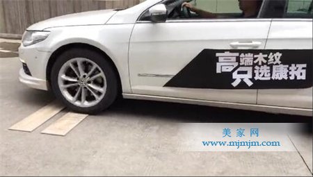 前面幾個特性的測試效果都很不錯。那這款瓷磚抗壓性又如何呢,一起來看看。為了測試抗壓性,幾經討論之后,最終決定用小車來做道具,小小木紋磚想要挑戰1.7噸的CC,檢測人員表示質疑。從受力的角度來說,200*1200*10MM的小片瓷磚受力面積很窄,能HOLD住小車的重壓嗎?
