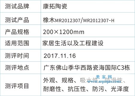 測評總結:外觀、規格、吸水率、防滑性、耐磨性、抗壓性、防污性等多個角度進行檢測,橡木MR2012307與MR2012307-H的各項測試均完美通過。規格嚴謹、紋理逼真、花色豐富,且高抗壓、防滑、耐磨、低吸水、是一款性能卓越的瓷木磚產品。