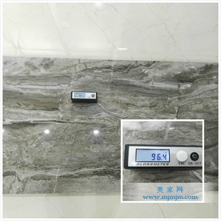 瓷磚的光澤度對空間裝修的美感有很大的影響,而且若瓷磚有磨損的情況,也會因磨損前后出現不同的光澤度。測評人員用專業的光澤儀在瓷磚表面不同的位置進行測試,然后取平均值,得出的結果是96.4。