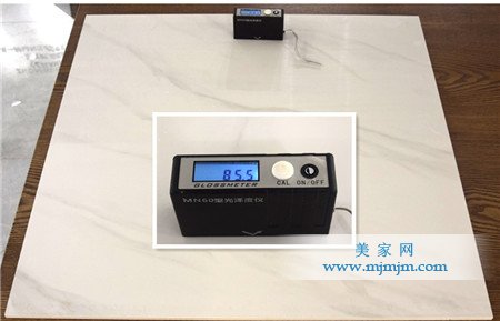 接下來,美家網(wǎng)測評小組對這款瓷磚的光澤度進(jìn)行了測試。測評人員將光澤測試儀置于瓷磚表面,在瓷磚表面移動不同的位置測試,最后選取多個位置光澤度的平均值。測試的結(jié)果為85.5度,與中盛陶瓷給出的數(shù)值范圍一致。