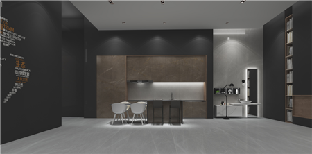 巖板家居應用展示為主,以模塊組合形式展示,其它裝飾面以深色漆為主,讓空間標準在終端復制性強,展示大巖板加工成家具整體優勢。