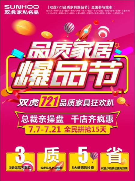 近段時間來,隨著房地產市場再度回暖,廣大購房者的置房熱情逐漸升溫,家具購買也悄然進入了每個家庭的生活計劃之中。在銷售熱潮來臨之際,雙虎家私名品率先打響了今夏家具市場全國特惠活動的第一槍。據雙虎家私名品官方透露:“本次以《品質家居爆品節》為核心主題的家居嘉年華活動將于7月7日—21日在雙虎旗下全國1835家專賣店同時舉辦,涵蓋臥室、客廳、餐廳等200多樣家居暢銷爆品,樣樣都是消費者評選出的品質佳品。這次以尊重消費者購買和使用習慣為特色的家居盛會,規模空前宏大,還有獨具特色的互動環節,相信再挑剔的消費者也會大呼過癮!”