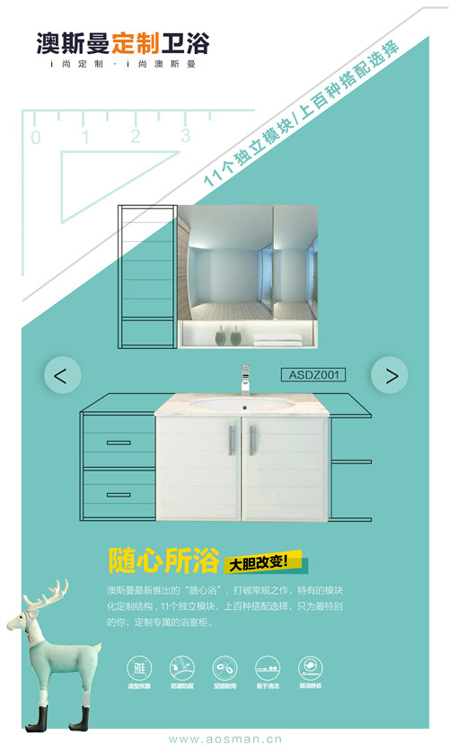 澳斯曼衛浴推出的定制柜產品系列,打破常規之作,特有的模塊化定制結構,11個獨立模塊,上百種搭配選擇,打造定制專屬于消費者的浴室柜。