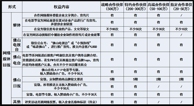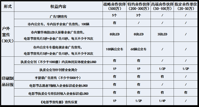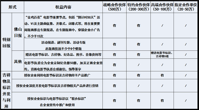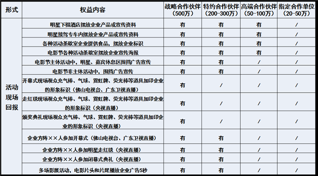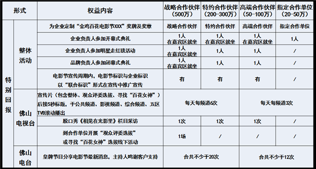 此外,企業還會獲頒“金雞百花電影節合作伙伴”稱號及牌匾,并且可用于商業推廣;企業負責人獲邀出席活動,并在禮賓區就坐;企業宣傳及LOGO將會出現于活動現場,包括明星紅毯儀式采訪區以及明星下榻酒店。(具體條款請參考招商方案)