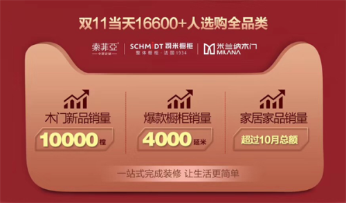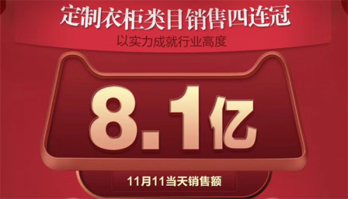 據索菲亞發布的數據顯示,雙十一當天其銷售額達8.1億,位居天貓美家及定制衣柜類目第一名,下午15時25分即超越2017年雙十一總銷售額,銷量比去年增長44%。大家居強勢霸屏,799系列爆款衣柜賣出22000件,¥799+100㎡全屋定制搶購近30000件,超過16600人選購全品類,其中米蘭納木門新品銷量達10000樘,司米櫥柜銷量達4000延米,家居家品銷量超過10月總額。