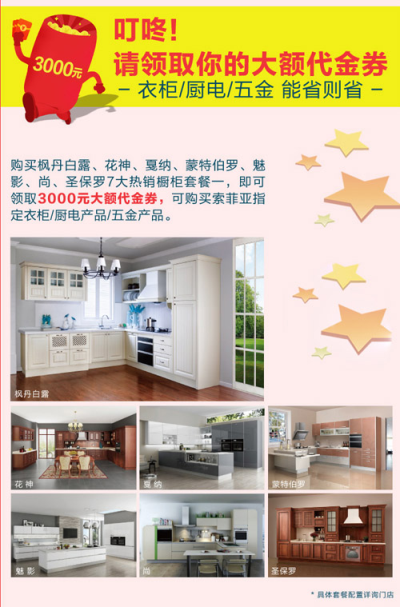 活動期間,凡購買司米櫥柜楓丹白露、花神、戛納、蒙特伯羅、魅影、尚、圣保羅這七款經典櫥柜任一款,均可獲贈3000元代金券。代金券可用于購買4㎡索菲亞799套餐移門大衣柜或者司米廚電五金產品。此外,司米櫥柜與索菲亞衣柜櫥衣同購滿38000元(司米櫥柜與索菲亞衣柜各滿10000元以上),即可加1999元換購西門子價值3729元的洗衣機。