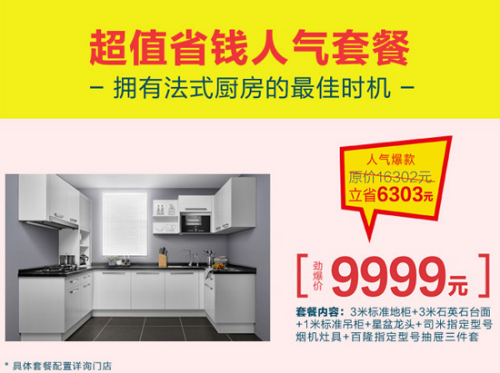此外,司米櫥柜的年度人氣爆款櫥柜套餐——雙城也推出了雙11狂歡節9999元的驚爆價,套餐包括3米標準地柜、3米石英石臺面、1米標準吊柜、龍頭、水槽、司米煙機、司米灶具、2低1高百隆金屬騎馬一體抽,配套齊全,一經入手立省6303元。除了櫥柜以及基本的廚電配置套餐外,此次司米櫥柜還推出了增值套餐,購買櫥柜滿3萬元,僅需加89元即可購買蒸箱或烤箱1臺。