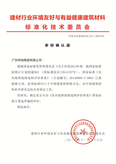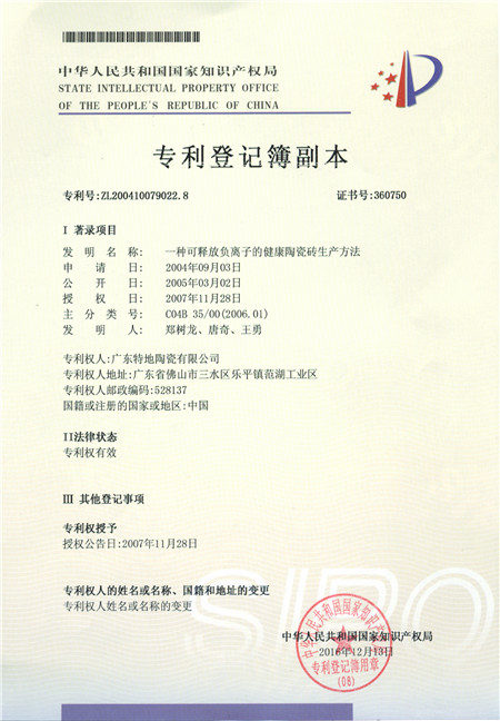 特地·負離子瓷磚在十余年的發展中一直堅持原創,在自主創新研發的道路上不懈努力。2004年,特地把健康環保融入瓷磚,與中山大學潛心研制出能“產生負離子,凈化空氣”的功能瓷磚。2007年,特地•負離子瓷磚榮獲國家發明專利證書【專利號:ZL 2004 1 0079022.8】。2017年,特地成為負離子瓷磚三大標準制定者,為負離子功能瓷磚品類市場保駕護航。