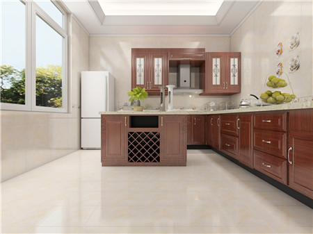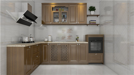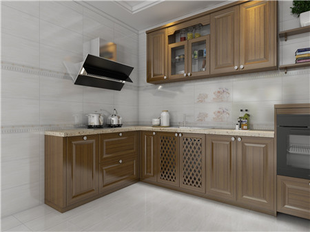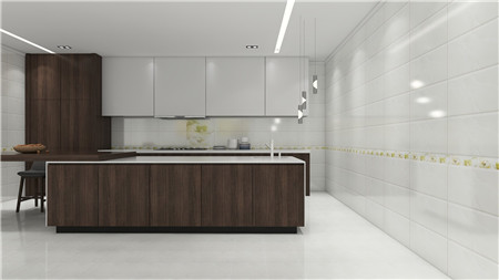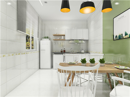 淺綠色腰線作為點綴,廚房選用亮面噴墨瓷片