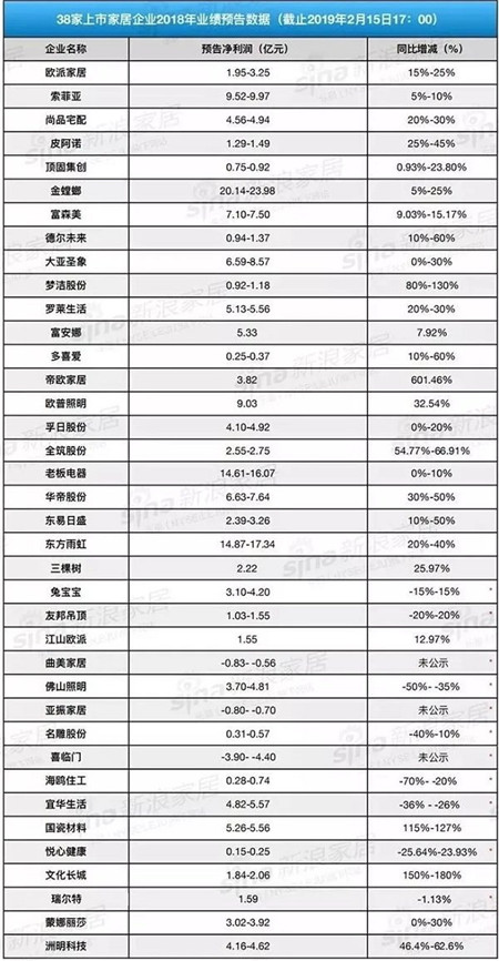 截止至2月17日, 38家上市家居企業發布了其2018年業績預告。經統計發現,共計27家業績預計同比增長,比例達71.05%,8家預計同比下降,只有3家企業預計虧損。