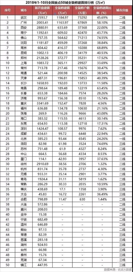 綜上,2018年1-10月全國重點50城全裝修建面主要集中在二線城市,全裝修建面TOP10城市有8席是二線城市,其中排在前叁位的城市分別是武漢1184.97萬㎡、廣州1163.97萬㎡、西安633.69萬㎡。此外,全裝修比例達到30%的城市占比為34%,未達到30%的城市占比為66%,全裝修市場的發展仍需要政府、開發商等各方面主體積極參與推動。