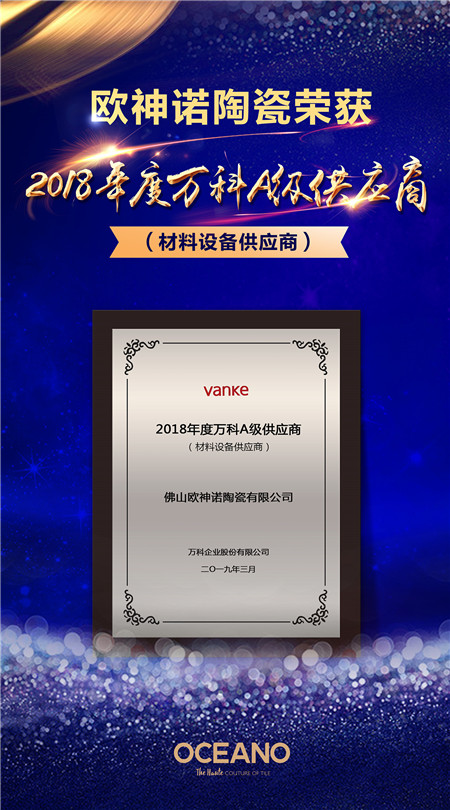 歐神諾榮獲2018年度萬科“A級供應商”榮譽稱號