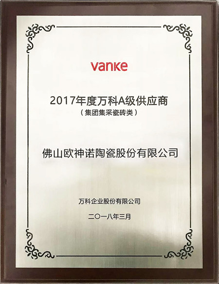 2018年歐神諾榮獲萬科“2017年度A級供應商”榮譽稱號