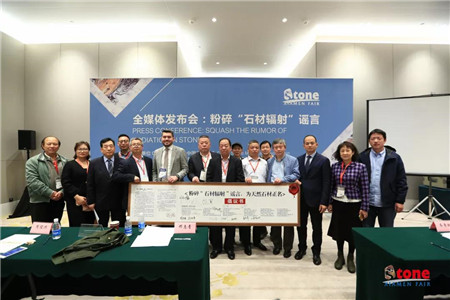 中國石材協會、廈門石材展組委會聯合舉辦的全媒體發布會:粉碎“石材輻射”謠言圓滿召開,四位石材行業權威專家代表共同發聲。國外行業組織、國內重點省市石材協會、商會及行業重點企業、權威檢測機構的與會代表上臺簽署了聯名倡議書,攜手一致,鄭重發聲,展現出為天然石材正名的決心。