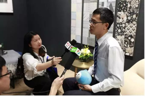 4月19日,潭洲陶瓷展開幕式后,廣州日報特邀新明珠集團常務副總裁葉永楷做客廣州日報在展會現場設置的直播間,講述新明珠用科技與藝術實現“走出去”的遠大目標。