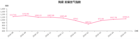 5月份,山東臨沂商城陶瓷類發展景氣指數收于1038.21點,環比上漲20.43點,漲幅2.01% 。