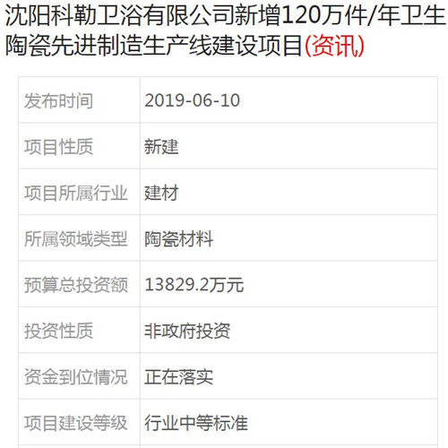 據(jù)科勒衛(wèi)浴在某項(xiàng)目招標(biāo)網(wǎng)上發(fā)布的信息顯示,科勒衛(wèi)浴本次改擴(kuò)建項(xiàng)目是在原有年產(chǎn)100萬(wàn)件衛(wèi)生陶瓷的基礎(chǔ)上每年新增產(chǎn)120萬(wàn)件衛(wèi)生陶瓷,年產(chǎn)衛(wèi)生陶瓷量可達(dá)220萬(wàn)件,項(xiàng)目總投資為13829.2萬(wàn)元。