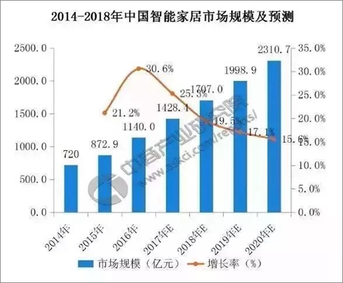 伴隨著人工智能技術(shù)的不斷完善,智能家居產(chǎn)品種類日益增多,2017年中國智能家居市場規(guī)模達1428億元,增長率為25.3%,雖增長有所放緩,但市場規(guī)模將保持穩(wěn)定增長,2020年市場規(guī)模將突破2000億元。