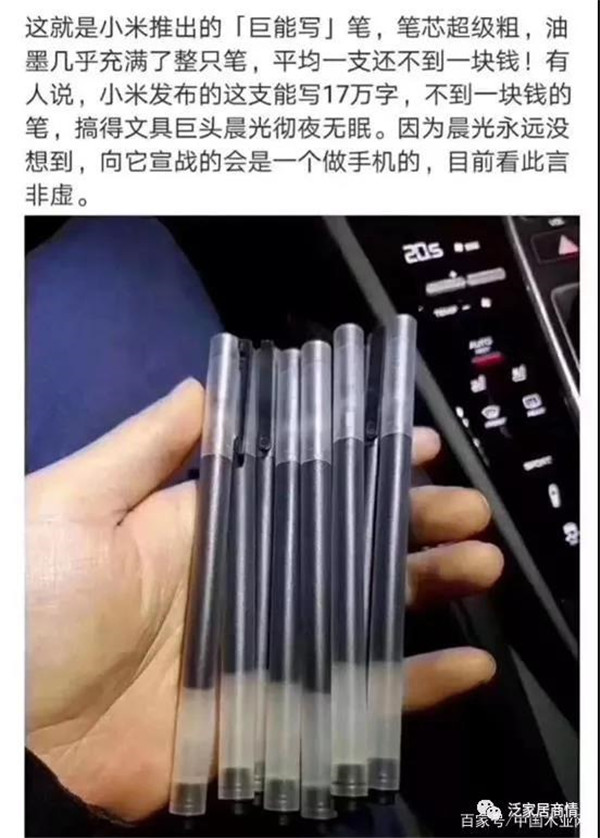 小米的這只筆,可以書寫17萬字,誰也沒有想到,一個互聯網電子企業,會來進軍文具產業,晨光永遠沒有想到,向他宣戰的,竟然是一個做手機的。小米的營銷,才是掠奪式的和長久的。值得全屋定制家居行業學習。