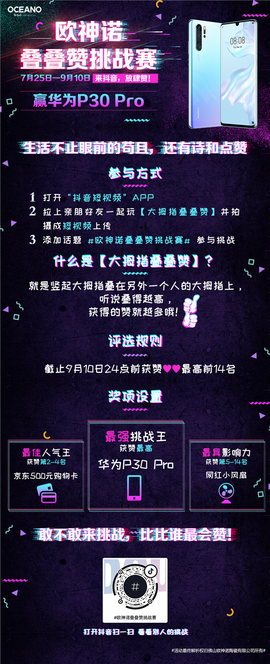 參加歐神諾抖音挑戰(zhàn)賽,贏華為P30 Pro