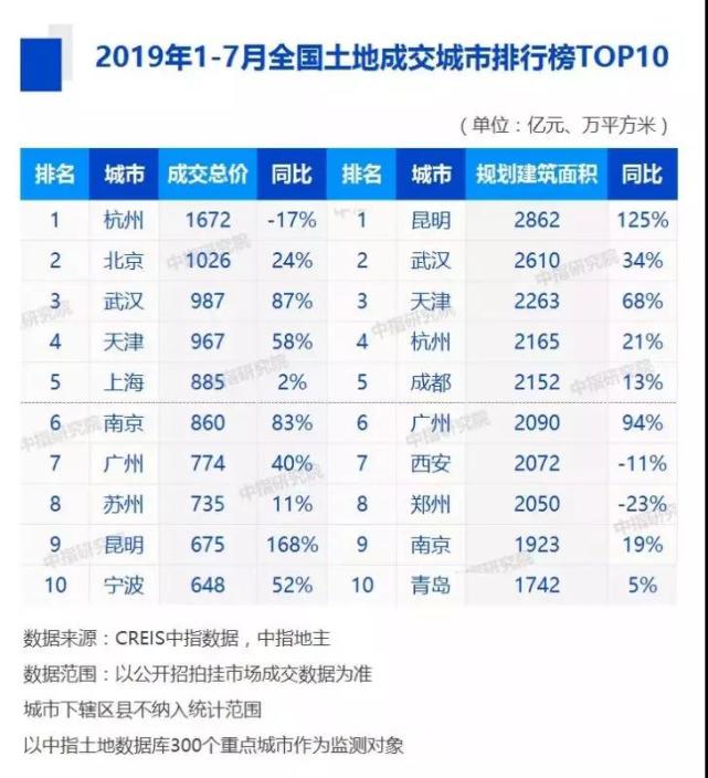 2019年1-7月,全國土地成交金額TOP10城市累計(jì)成交9229億元,同比增長14.8%,增速較1-6月回落1.2個(gè)百分點(diǎn);規(guī)劃建筑面積TOP10城市成交21929萬平方米,同比增長18.3%,增速較1-6月上升9.3個(gè)百分點(diǎn)。