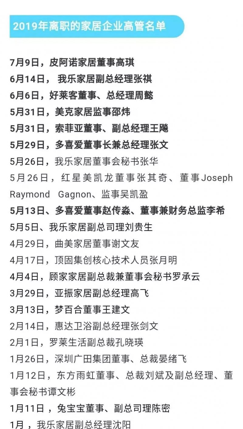 2019年,在25位上市家居企業高管離職中,有8位是定制家居企業的高管。