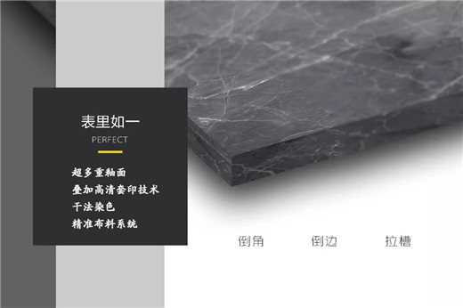 采用超多重釉面疊加高清套印技術,干法染色以及精準布料系統,讓瓷磚紋理深入到坯體底層,確保產品在任何角度、任何切割方法都能呈現全方面展現高品質效果。