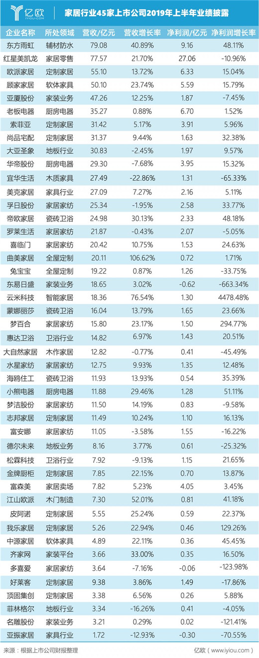 2019年8月30日盤后,宜華生活、好萊客披露年中報,至此,除敏華控股將于11月發布中報外,家居行業45家上市公司2019年中報已全部出爐。