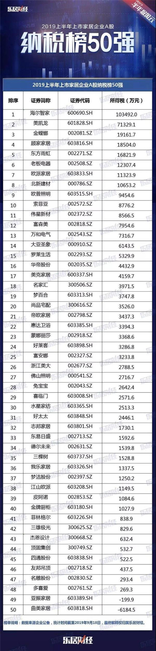 在50家A股上市家居企業(yè)中,海爾智家以10.35億元所得稅高居頭名,美凱龍以7.13億緊隨其后。其中,金螳螂、顧家家居、東方雨虹、老板電器、歐派家居、北新建材幾家企業(yè)繳納的所得稅均突破億元。2019 年上半年,納稅破億的家居企業(yè)共8家。