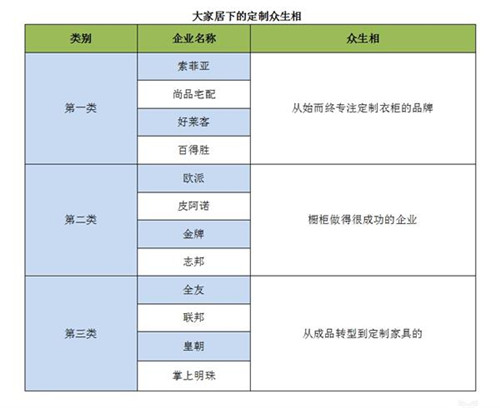 第一類,從始而終專注定制衣柜的品牌。這一類已經走在了行業的前列,引領著這個時代的步伐,比如:索菲亞、尚品宅配、好萊客、百得勝等等。