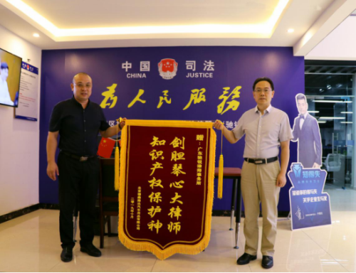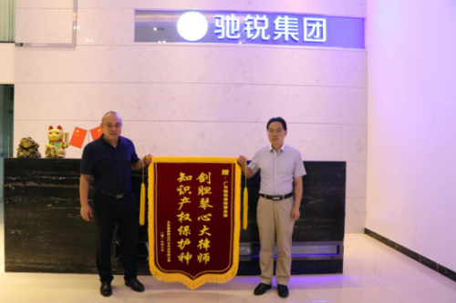 2019年10月28日,我所張達富律師、崔海春律師承辦的專利侵權民事案件,因盡心盡責、誠信服務,北京德鑫路達汽車用品有限公司的負責人熊先生特地向廣東馳銳律師事務所送來一面上書“劍膽琴心大律師,知識產權保護神”的錦旗以示感謝。