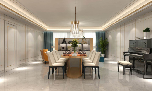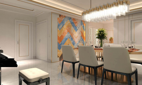 在天山熙湖的設計案例中,一抹空間中亮眼的橙色,溫暖了整個場景,也宣揚著業主的熱情。整個空間以暖灰色系為主調,將簡約風格與時尚輕奢元素相結合,搭配不同程度的橙色和金色提亮整個空間。細膩的皮質沙發搭配光潔靚麗的大理石紋理地磚,溫暖與沉穩,都恰到好處,給人帶來絕對的舒適感。而深淺不一的藍色,散落在各個空間里,與橙色似乎發生了奇妙的化學反應,讓人印象深刻。