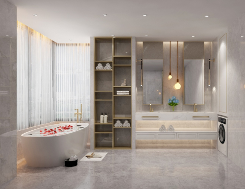 灰與白的交響,構筑出干凈、溫柔的浴室,而金色金屬元素在燈光的渲染下,為整個空間帶來了精致的品質感,讓每一次沐浴都充滿著優雅與儀式感。