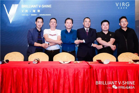 ▲VIRG CASA品牌營銷總經(jīng)理聶軍鋒(右3)攜手經(jīng)銷商代表們簽署樣板市場打造協(xié)議