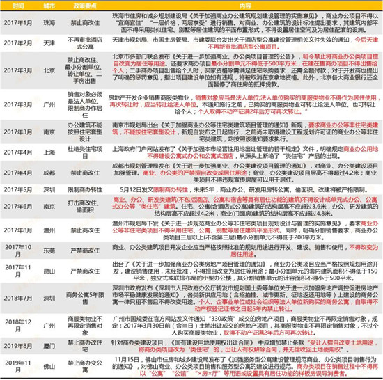 自2017年3月北京出臺了針對商辦項目的調控政策之后,上海、廣州、深圳、成都等一線和部分熱點二線城市緊隨其后,到2019年8月,廈門出臺最嚴“禁公寓令”,“商改辦”、“商改住”全部杜絕。