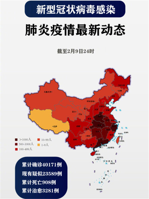 截至2月9日24時,國家衛生健康委收到新冠肺炎疫情最新情況,全國累計確診40171例新冠肺炎累計死亡908例,累計治愈3281例,現有疑似病例23589例。