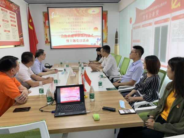 為深入貫徹落實黨的十九大會議精神,大力加強支部建設,強化黨建引領非公經濟高質量發展的核心作用,按照“以共建促黨建,以共建促了解,以共建促合作,以共建促發展”的原則。經過長期的醞釀與討論,中國共產黨佛山市禪城區陶瓷行業協會支部委員會與中國共產黨佛山市委統戰部機關第一支部委員會、中國共產黨佛山大來有限公司支部委員會舉辦聯合共建單位揭牌儀式。市委統戰部副部長、機關黨委書記徐彥林、市委統戰部機關第一支部委員會書記王貴彬、禪城區陶瓷行業協會支部委員會紀檢委員王作武、佛山科學技術學院校團委副書記梁燕云、佛山大來公司董事長伍庭光等領導出席儀式。