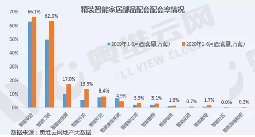 從精裝智能家居整體配套率來看,2020年上半年絕大部分的智能家居的配套率較去年同期有明顯的增長。其中,智能坐便器配套率為17%。整體來看,一線城市、新一線城市對于該部品的接受度均高于總體水平。而智能花灑等部品配置率仍不足5%,但從趨勢來看,呈增長態勢,較去年同期配置率有明顯的增長。