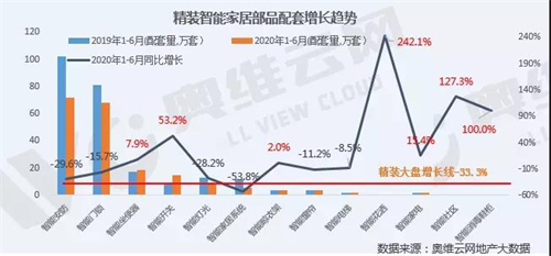其實,企業就是不斷進化的過程,進化的邏輯在于在圍繞客戶價值不停地創新。在以智慧時代為主流趨勢,家居企業逐步智能方向轉變。據奧維云網地產大數據2020年300城+調研數據顯示,2020年1-6月精裝樓盤新開盤項目套數為108.34萬套,同比下滑幅度已經從-44.5%慢慢攀升,目前的同比降幅維持在-33.3%。精裝智能家居部品雖然不可避免的受到了大環境的影響,但精裝智能家居市場呈現了與其他部品配套不完全相同的增長趨勢。從下圖可以看出,紅線是精裝大盤總體增長趨勢點,-33.3%。其中,智能坐便器、智能花灑1-6月分別增長了7.9%、242.1%,遠高于精裝大盤的增長趨勢。