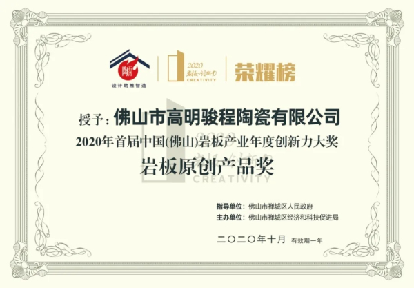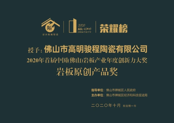 #駿程陶瓷#盛世美 “巖”, “巖”選質量,“巖”值擔當,“巖”用廣泛,斬獲本次2020年首屆中國(佛山)巖板產業年度創新力大獎中巖板原創產品獎項實至名歸,千“巖”競秀,駐足盛世美巖,駐守時尚生活。