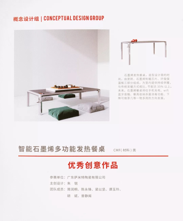 在開幕活動上,主辦方對獲得2020年“市長杯”工業設計大賽的優秀作品進行表彰,并頒發“市長杯”扶持項目榮譽證書和獎杯。其中,由新明珠陶瓷集團研發的智能石墨烯多功能發熱餐桌榮獲概念設計組“優秀創意作品”、“CMF(材料)類創新作品”;香云紗瓷磚榮獲產品設計組“優秀設計作品”、“CMF(材料)類創新作品”,再次證明了新明珠強大的產品研發創新能力。