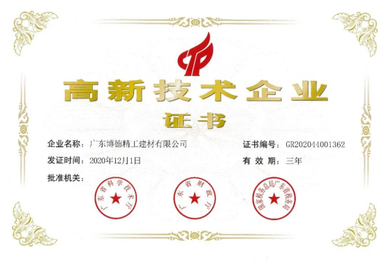 2004年,博德公司首次通過高新技術企業認定,是廣東省陶瓷行業最早一批高新技術企業。此后,博德連續七次通過高新技術企業復審認定,還在2006年被認定為國家火炬計劃重點高新技術企業,是行業當中為數不多的連續多年的國家高新技術企業之一。