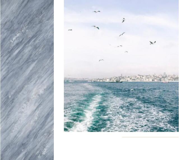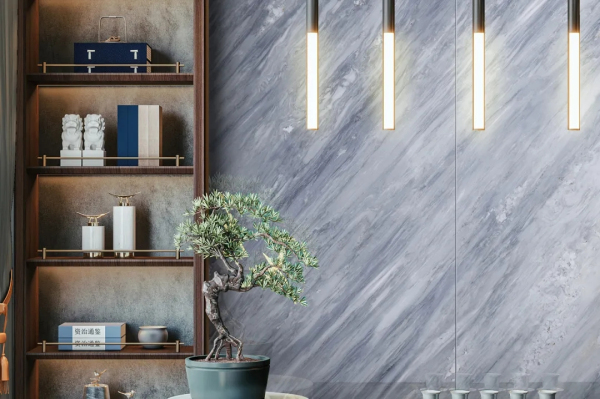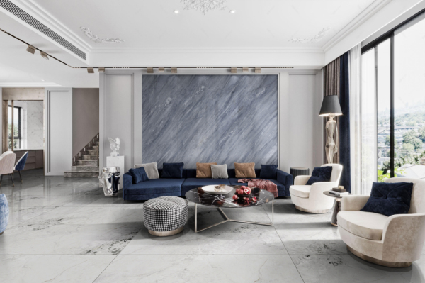 深邃藍色夾雜灰白色45°斜紋,張揚奔放,如同奔流碧濤,給人一種波瀾壯闊的大氣之感。65-75°的自然柔和光澤,是寶石自然本色,仿佛浪花在陽光之下,耀眼的晶閃光芒,整個空間更靈動、更高級、更亮眼。