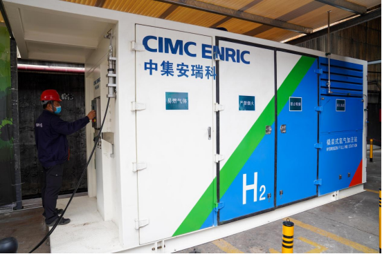 從供氫、加氫,到氫能叉車的日常運行維保,需要一系列配套設備、專業場所支撐,為此蒙娜麗莎在LNG站內建起氫能叉車加注站。該移動式加氫站的設備和管理系統集成在20英尺集裝箱中,加注壓力為35MPa,加氫能力為15kg/h。以每天12小時連續工作情況下,可滿足50臺叉車加注量。在簽約儀式完成后,各領-導嘉賓走進新建的加氫站參觀氫能叉車操作演示,共同見證這一氫能應用進程中不同尋常的時刻。在英飛騰(佛山)氫能源總經理胡泉以及中集安瑞科技術總監李懷恩的講解下,氫能叉車依次到加氫站進行現場氫氣加注,并完成發車儀式。