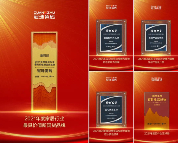近期,由騰訊家居、貝殼主辦的“榜樣力量——2021年度騰訊家居|貝殼瓷磚品牌頒獎盛典”,以及由優居主辦、貝殼找房戰略支持的“‘時代追光者’2021中國家居品牌力量評選榜單”兩大盛典隆重舉行。冠珠瓷磚憑雄厚的綜合實力、強大的品牌影響力、硬核的產品創新力,以及卓越的營銷打造力,斬獲12項榮譽大獎。極大彰顯了冠珠品牌升級以來的強勁勢能,更是行業與市場對冠珠“賦能中國人的家,締造美好人居生活”的肯定與嘉獎。