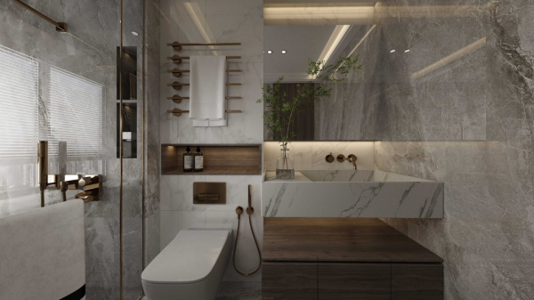 主衛墻地通鋪灰色大理石瓷磚,色調偏暖色,營造出溫暖的效果。黃銅色澤、金屬質感的衛浴配件,造就華麗上檔次且不浮夸的高級感,整體顯得低調,顏值也很高。